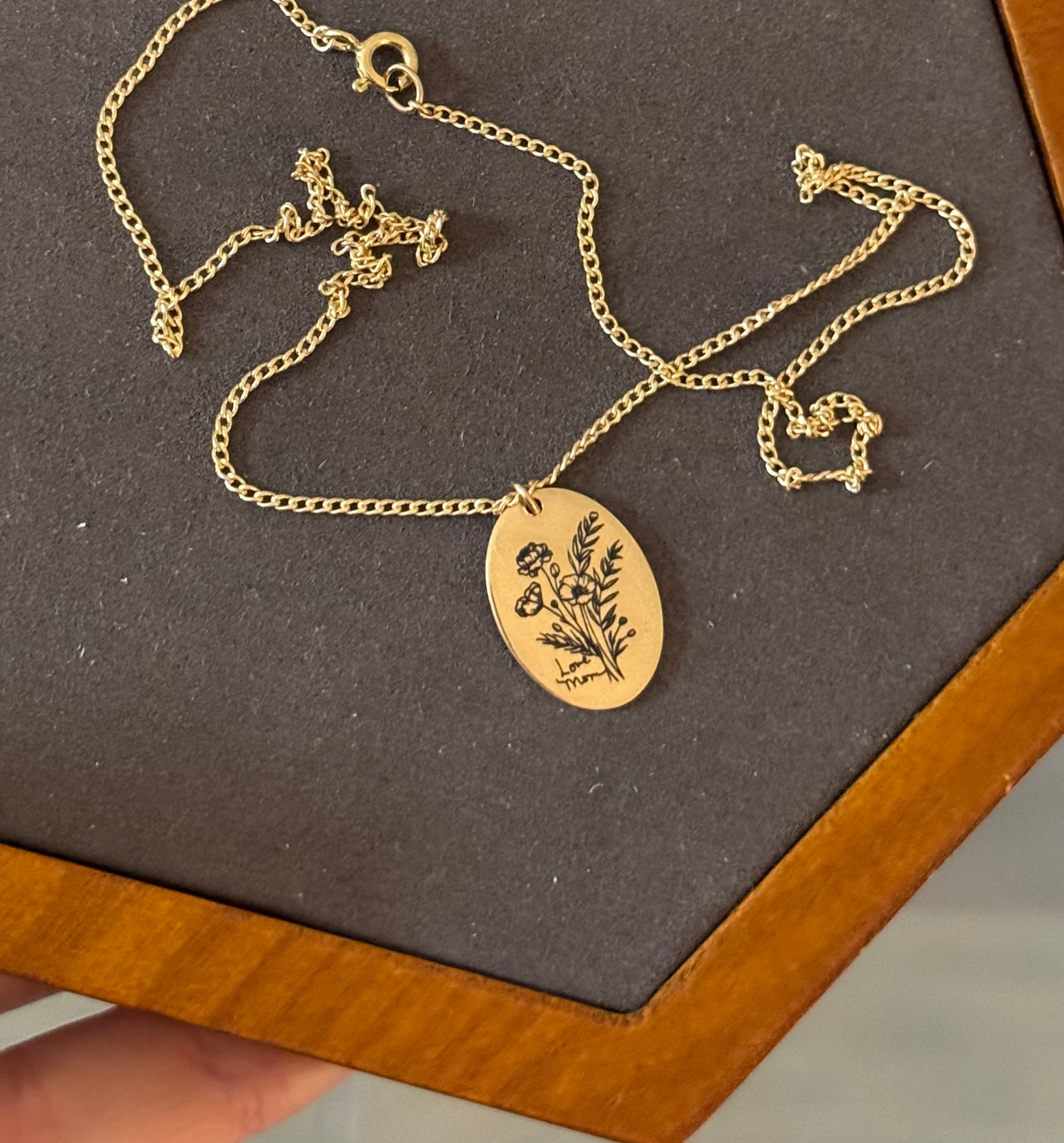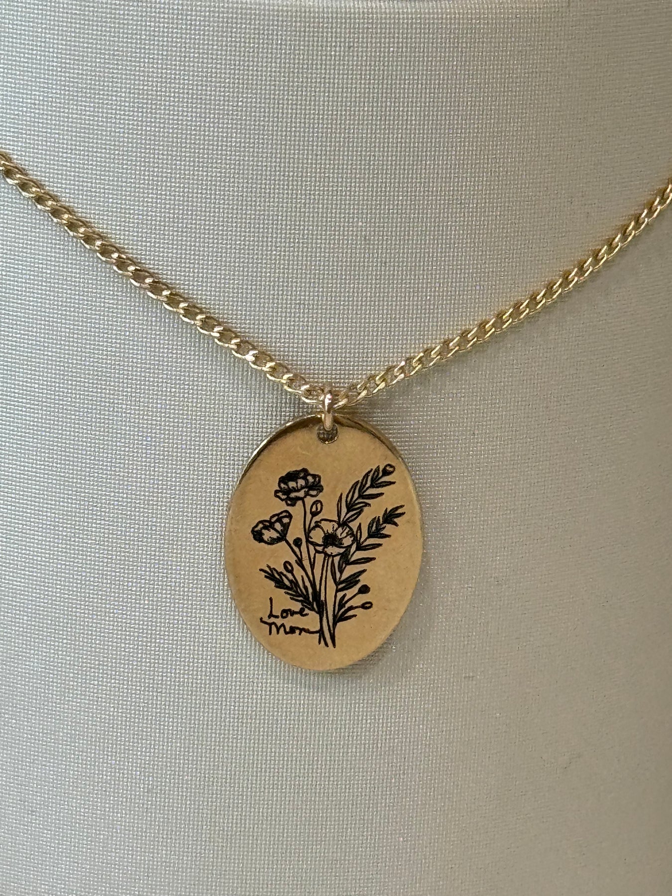 Your choice of Gold,Silver, or Rose Gold. 18” length. This is for the large pendant. Comes with custom engraving on one side. I will message and coordinate the design with you. We can utilize a loved one’s handwriting if you’d like, design a bouquet of birth flowers, or have them peeking around the edges.